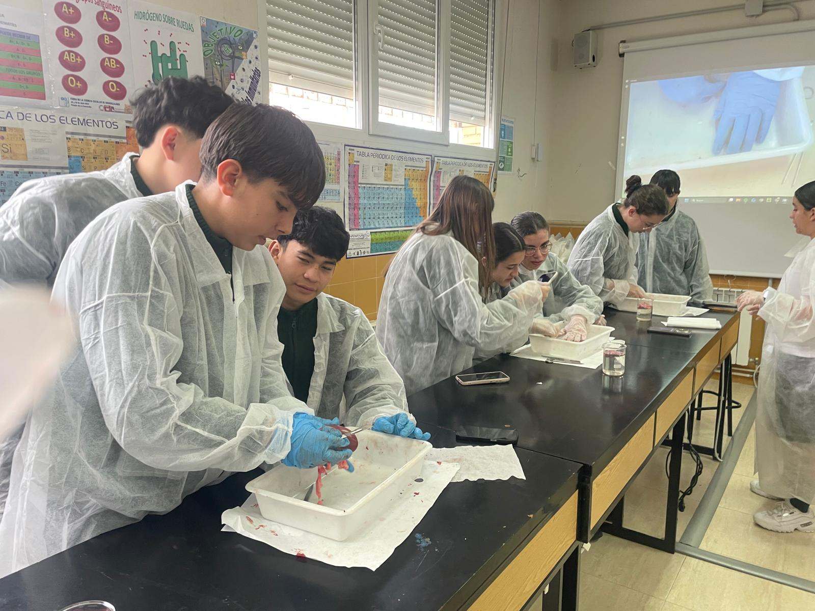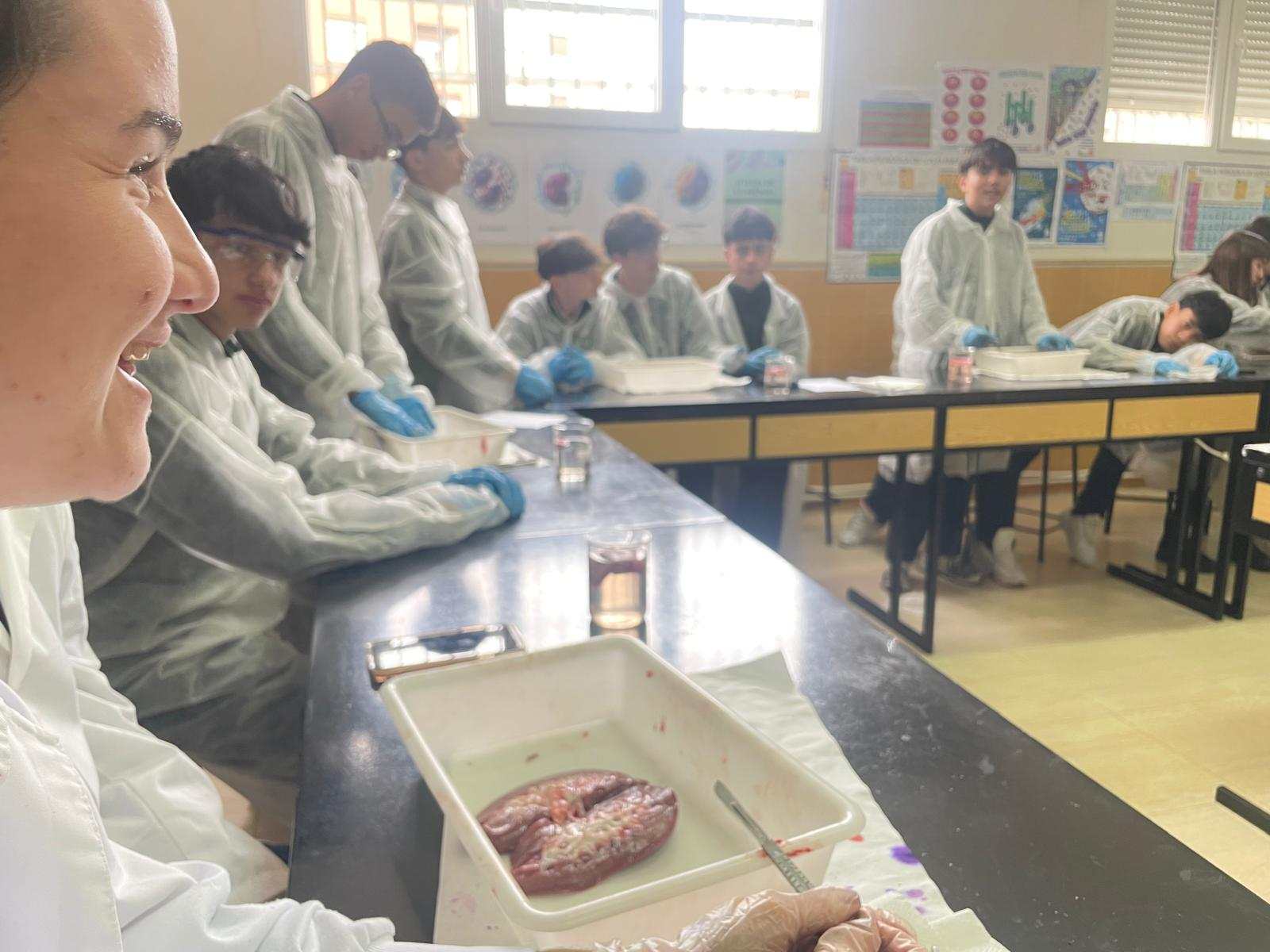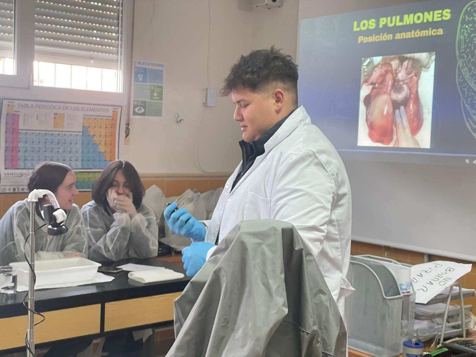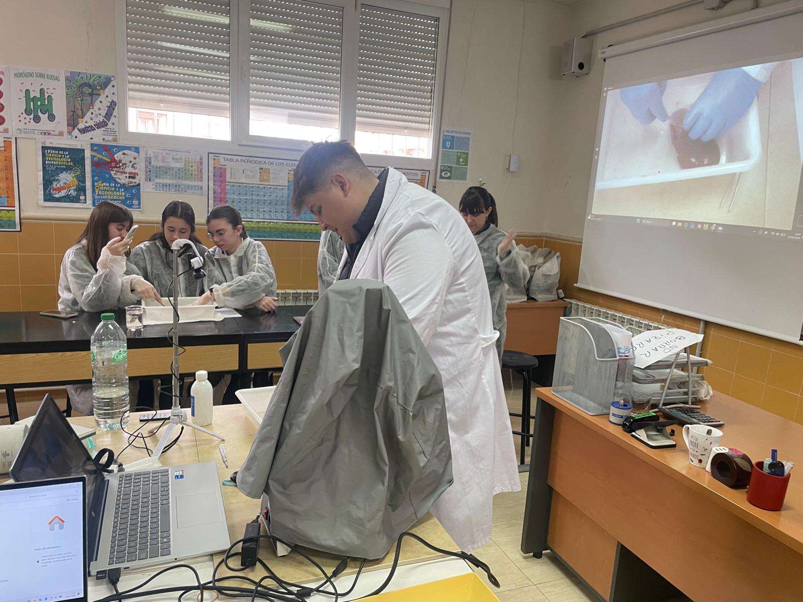 La práctica ha tenido dos sesiones, una primera en donde David Somolinos, estudiante de Grado Superior de Laboratorio de Diagnóstico Clínico y Biomédico y antiguo alumno del centro, ha realizado una presentación interactiva para conocer cuál sería el proceso de disección. Posteriormente, los alumnos se han puesto “manos a la obra”, y han realizado los distintos cortes anatómicos, para apreciar en profundidad las características anatómicas y fisiológicas de los tres órganos.